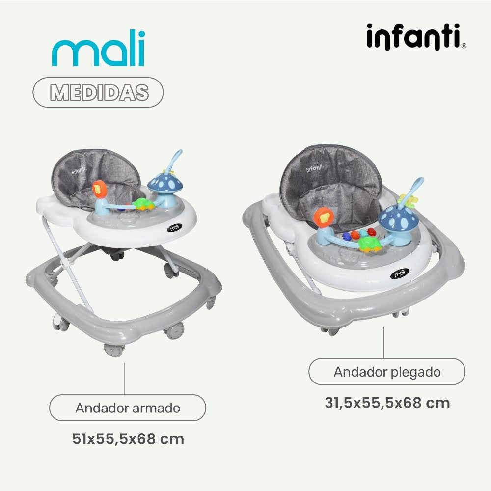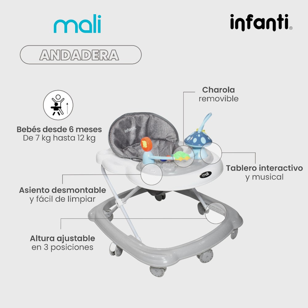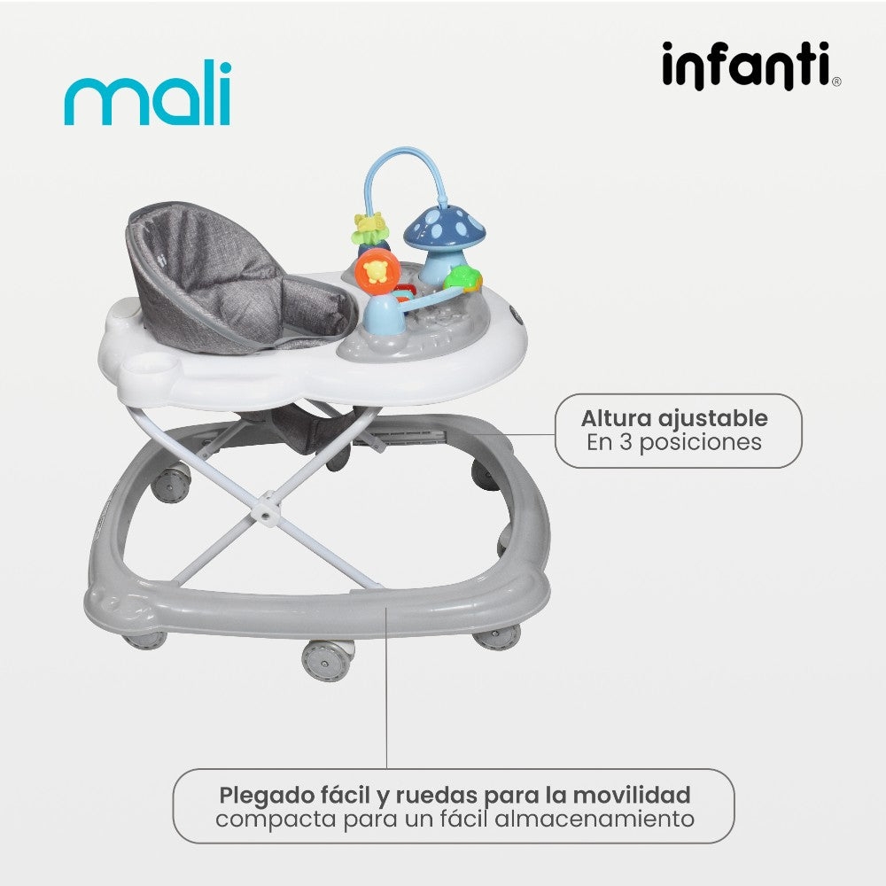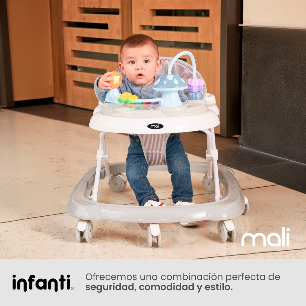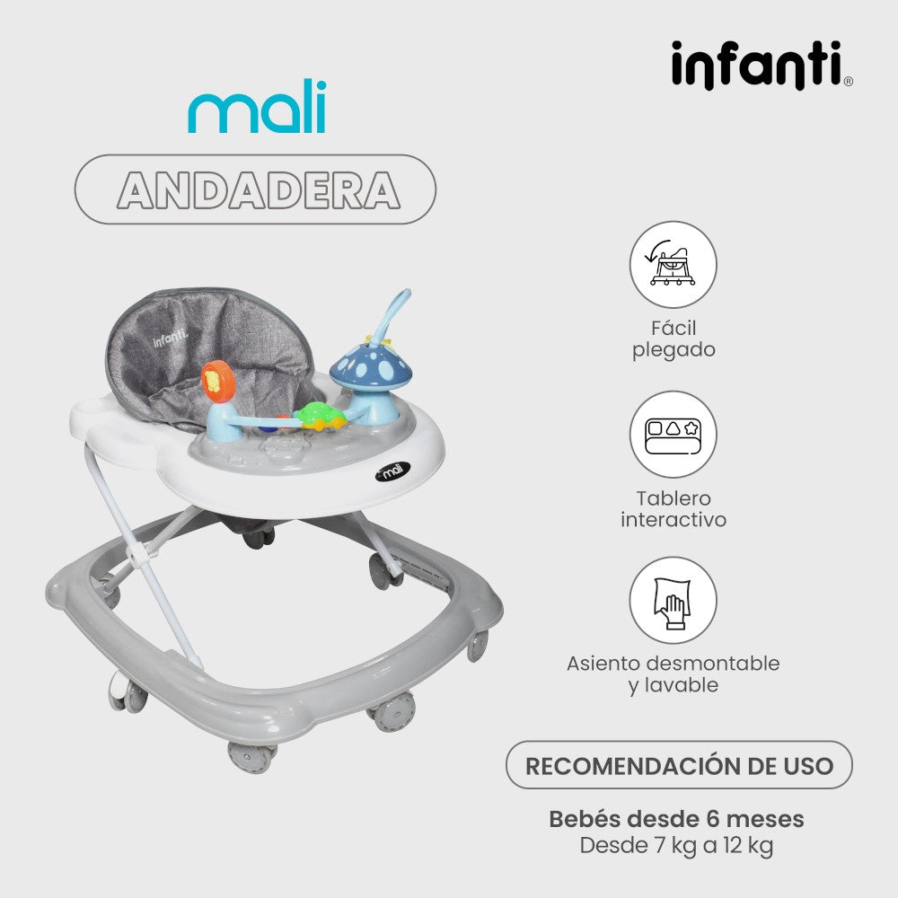 La andadera Mali de Infanti es la elección ideal para los primeros pasos de tu bebé. Su diseño plegable facilita su almacenamiento y trasporte.